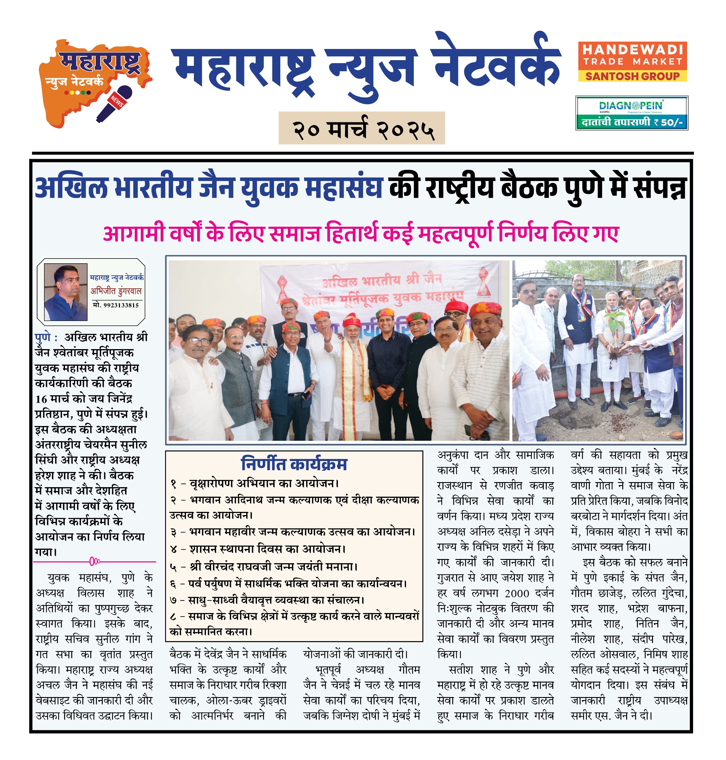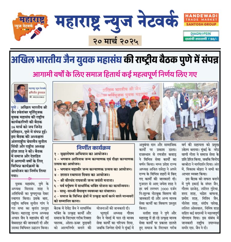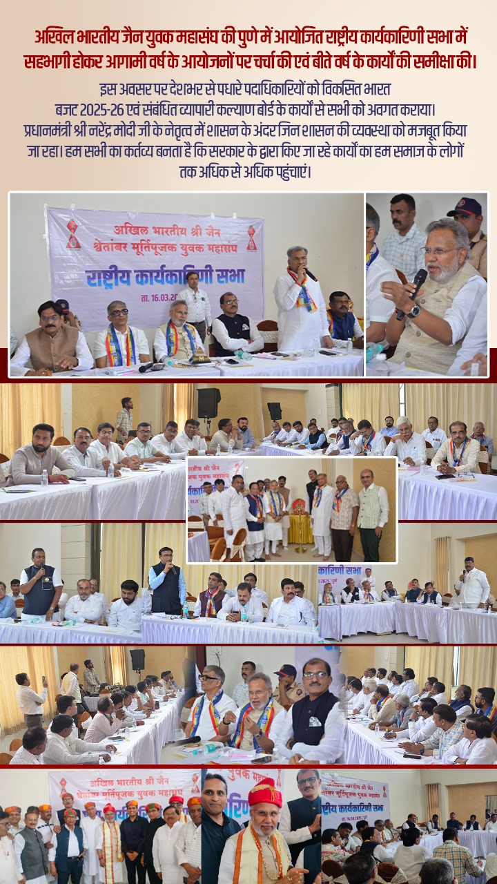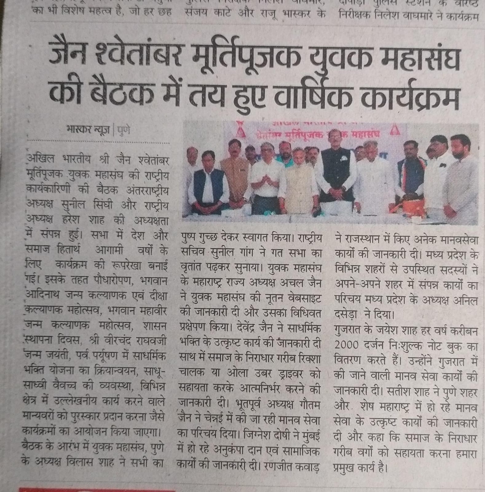 आज अखिल भारतीय श्री जैन श्वेताम्बर मूर्तिपूजक युवक महासंघ के राष्ट्रीय कार्यकरिणी की बैठक जय जिनेंद्र प्रतिष्ठान पुणे में संपन्न हुई।